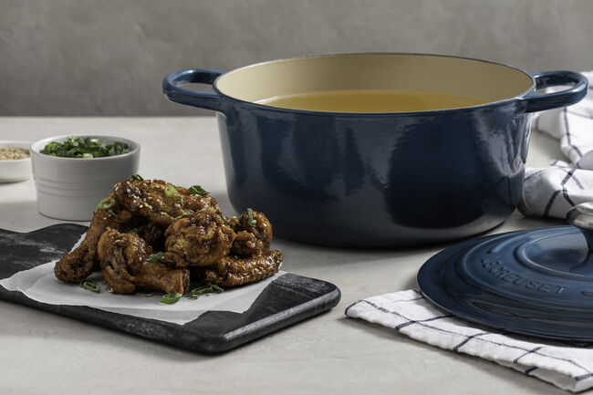 With sweet and salty Asian-inspired flavors, these wings are delightfully sticky, deliciously messy and impossible to stop eating. The key to wings that aren't greasy or burnt is to fry them in your Dutch oven. The enameled cast iron keeps the oil at just the right temperature so every batch turns out perfectly golden brown and crispy.