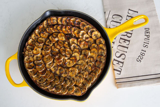 Place on a sheet pan and bake for 10 minutes. Remove skillet from the oven. Dip the sliced bananas in cinnamon sugar and arrange on top. Place the skillet back in the oven and continue baking for 30 minutes. Remove skillet from the oven and brush with additional melted butter if desired.