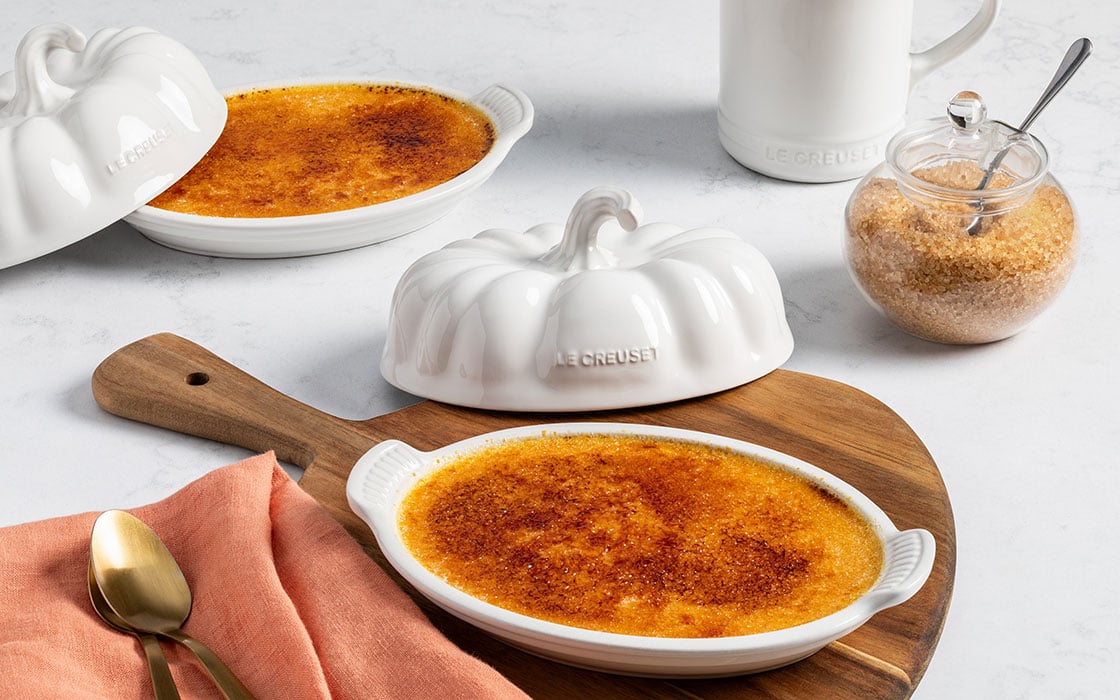 An autumnal take on a traditional French favorite, our Pumpkin Crème Brûlée starts with cream and egg yolks, enriched with the addition of pumpkin puree and seasonal spices. This comforting version of the classic is baked in individual stoneware Pumpkin Butter Dishes, using the gentle heat of a water bath to perfectly set the creamy custard base. The durable stoneware dishes are broiler safe, so the signature burnt sugar topping can be perfected under a household broiler without the need for a kitchen torch. If you don’t have these adorable fall-inspired dishes on hand, feel free to use any small, shallow baking dish, Ramekins or Mini Round Cocotte.