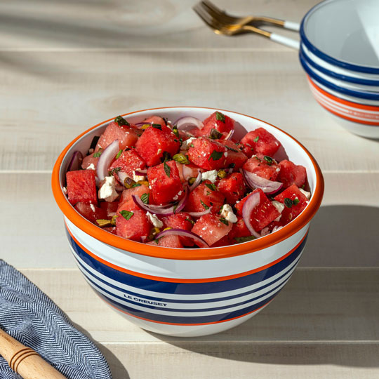 Offset the rich and smoky flavors of barbecued or grilled meats with this refreshing fruit salad. It’s basically summer in a bowl with juicy, sweet watermelon that is simply tossed with salty feta, cool mint and a touch of honey. You can replace the watermelon with any other type of summer melon, just be sure the melon is perfectly ripe. Wondering how to tell if a melon is ripe? Check out this 6-step approach from David Leite of Leite’s Culinaria.