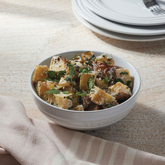 Potato salad is a must-have at every summer gathering. This take on the classic amps up the potato flavor by first roasting the potatoes and then tossing them with a briny tart dressing of yogurt and preserved lemon, along with plenty of fresh garden herbs. If you can’t find preserved lemons, feel free to substitute regular lemon zest and lemon juice in the recipe. Look for Meyer lemons at the market, they’re worth seeking out for their slightly sweeter flavor.
