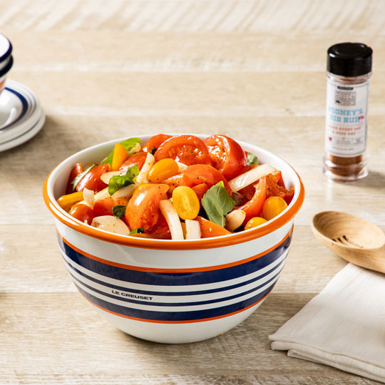 Impeccably ripe summer tomatoes and Vidalia onions are tossed with a simple mustard vinaigrette to bring out their juicy sweetness in this classic summer recipe. It comes to us by way of BBQ pitmaster Rodney Scott and the secret ingredient in the dressing is Rodney’s Rib Rub and Rodney’s Sauce – his signature vinegar and cayenne barbecue sauce. Best eaten at room temperature after the tomatoes and onions have softened slightly, this is a perfect salad for an outdoor picnic or party.