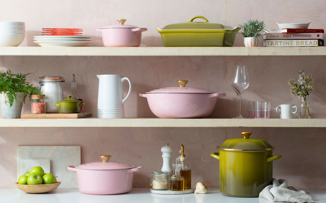 Look around: tight buds are beginning to unfurl, green is returning to the world and the earliest flowers are already in bloom. The stage is set for spring. As a colorful pioneering spirit, we often start the search for inspiring new cookware colors by looking to the natural world. The ever-changing shifts in nature track with the shifts in our collective mood and desires. The world is waking up and so are we. Hungry for color, we’re bringing warm, lively, fashion-forward hues like sun-soaked Olive and charming Chiffon Pink into the mix as a part of our Spring Shades Palette. This complementary blend of Olive, Chiffon Pink, Artichaut, White, Meringue and Licorice can be demure or daring, sweet or sophisticated depending on how you mix it. It’s the perfect palette to step up your spring style.