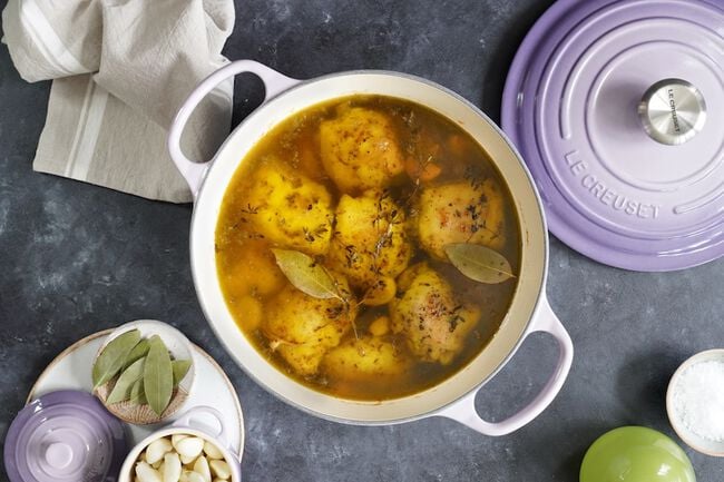 This recipe draws inspiration from the classic French technique for preserving food by slowly cooking it in fat. A fragrant dry brine of thyme, coriander, and preserved lemon not only seasons the chicken but also draws out moisture, resulting in a firmer, more succulent texture. A long, gentle bath in olive oil transforms the chicken thighs into a dish that is deeply tender and richly flavored. The result is as versatile as it is luxurious: crisp the skin for a golden finish, shred the meat into salads or pastas, or serve it simply with the tender garlic cloves and plenty of crusty bread.