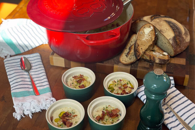 Chef Matt Jennings, founder of Full Heart Hospitality, loves a nice steaming cup of this chowder in the bleachers during an early spring baseball game, when the chilly New England breeze ripples through a sun-dappled Fenway Park™. His version is easy to make, thick and chunky but not gloopy, and packed with fresh New England clams. While it’s great the same day it’s made, it’s best if you can make this a day ahead, as the flavors marry very well overnight.