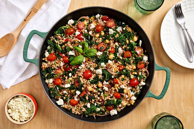 This farro and chickpea dish—somewhere between a hearty stew and a warm grain salad—is one of those recipes you’ll find yourself making a double-batch of every time you cook it. After enjoying it for dinner, perhaps alongside a roasted salmon filet, pack some up for lunch with lightly dressed arugula, or even heat up a bowl and top it with an olive-oil fried egg for breakfast. If you don’t have chickpeas in the pantry, this works just as well with cannellini beans, butter beans or pinto beans.