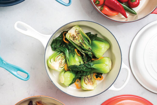 Quick, healthy and delicious, this recipe will become your go-to method for cooking vegetables and the technique can be adapted to any other sturdy, leafy green like chard, kale and mustard greens. For this version, tender heads of baby bok choy are given a quick sear before being steamed in a flavorful ginger, garlic and lime sauce. The addition of baby bell peppers adds a pop of crunch and color, while a shower of sesame seeds adds nuttiness and depth.
