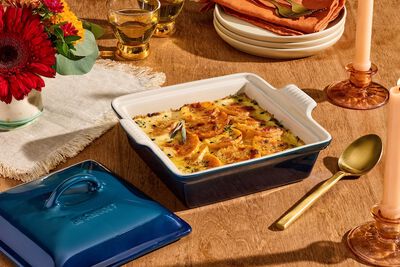 From oven to table, the beautiful design of the covered Heritage Shallow Square Casserole baking dish is perfect for indulgent desserts, comforting casseroles, marinating meats, broiling fish and more. Not only does the stoneware lid lock in moisture and heat while baking, but makes it easy to carry dishes to potlucks and picnics, or for storing leftovers. Crafted from premium stoneware to ensure food is cooked to perfection, the dishes feature a colorful glaze that is virtually non-stick for easy cleanup.