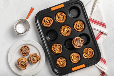 The deep cups of the 12-Cup Muffin Pan are perfect for making not just muffins, but also cupcakes, brioches, and a whole host of sweet and savory treats. An innovative silicone coating ensures easy release and effortless cleanup, while the heavy-gauge carbon steel construction delivers superior heat conduction and even baking. Lightweight and durable, the wide rims with heat-resistant silicone grips makes it easy to transfer a full pan to and from a hot oven.