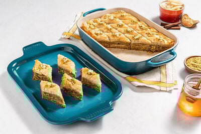 The Rectangular Dish with Platter Lid is designed for beauty and versatility from oven to table, and the two dishes can be used together or separately. Marinate meat or vegetables in the baking dish and then use the platter lid to serve after grilling or baking. Or use the baking dish on its own for everything from rich desserts to roasting vegetables, bubbling casseroles and more – the lid makes it easy to store leftovers. The platter lid is also an attractive serving piece for cheese, appetizers and salads. Crafted from premium stoneware to ensure food is cooked to perfection, the dishes feature a colorful glaze that is virtually non-stick for easy cleanup.