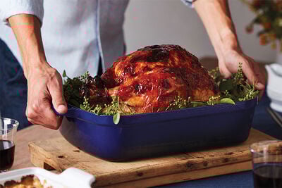 The Signature Roaster is perfect for roasting meats, poultry and vegetables, as well as making family-sized casseroles and side dishes. It features a low-profile design that is optimized for oven roasting and even browning, and a generous cooking surface for making gravies and sauces. Crafted from our legendary enameled cast iron, the Signature Roaster has exceptional heat distribution and retention qualities to keep dishes warm or cold, and wide loop handles for easy maneuvering from stove to oven to table for effortless serving. A versatile piece of cookware year-round, the vibrant enameled surface minimizes sticking and staining, requires no pre-seasoning and is easy to clean.