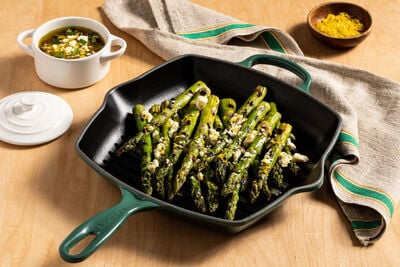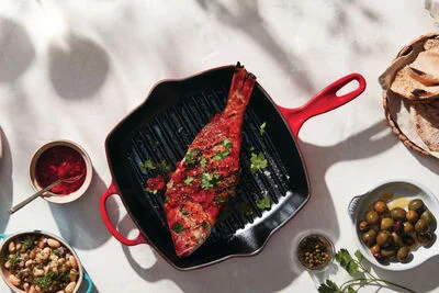 The enameled cast iron Signature Square Skillet Grill brings the delicious flavor of outdoor grilling conveniently indoors. The interior surface is finished with a black satin enamel that eliminates the need for the traditional seasoning and maintenance of raw cast iron, and the enamel develops a natural patina over time that is ideal for searing. The high ridges create perfect sear marks, and allow excess fat and grease to drain away from the food. Loop handles make it easy to maneuver a full pan, and the spouts on two sides allow for drip-free pours.