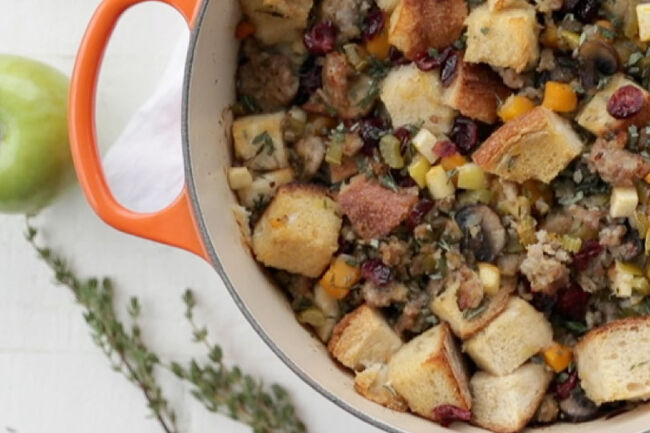 Remove the bread from oven and combine it in the Dutch oven. Add the chicken stock and dried cranberries and stir until all ingredients are mixed. Place the mixture in the oven, baking at 350 F for approximately 30 minutes, or until golden brown.